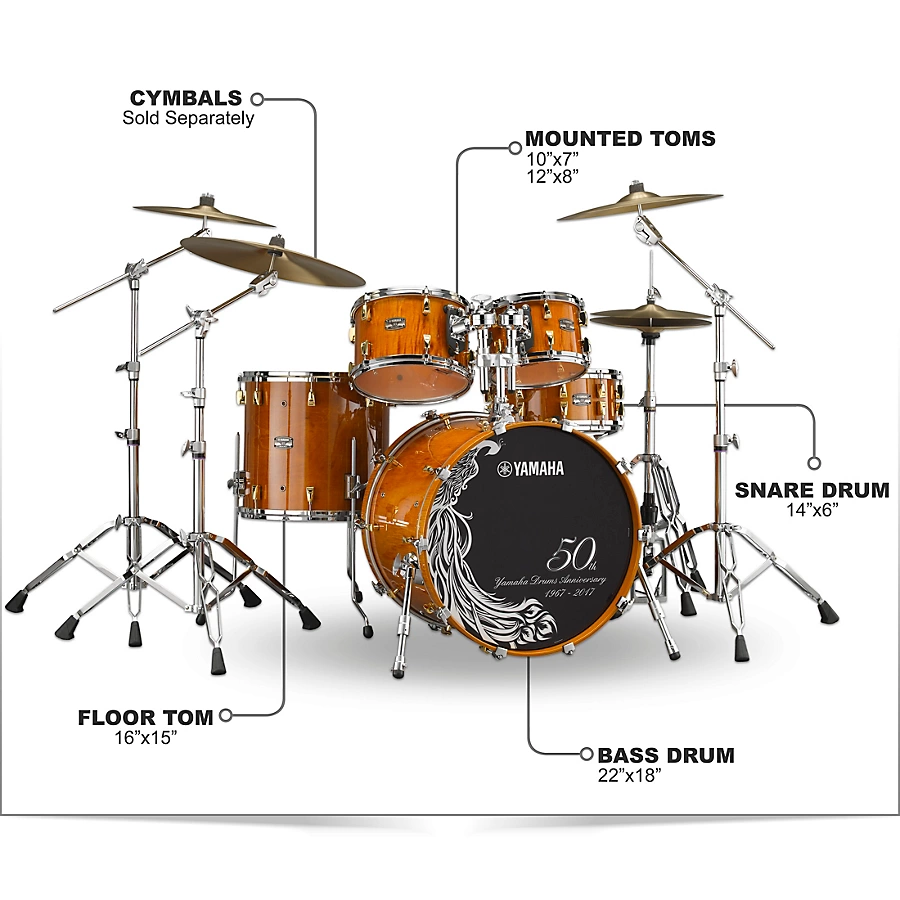 To celebrate 50 years, Yamaha Drums is introducing two limited-edition drum sets to commemorate this special anniversary. These sets offer Absolute Hybrid Maple shells, each with its own striking finish: Birdseye Maple in an Amber Sunburst finish and Curly Maple in an Antique Natural finish. Each limited-edition set is adorned with gold lugs and a special laser-cut 50th Anniversary badge.