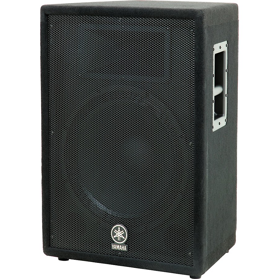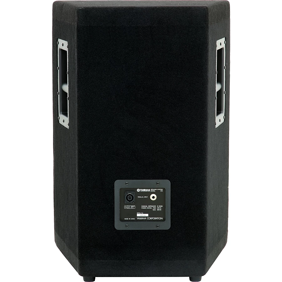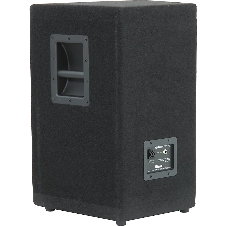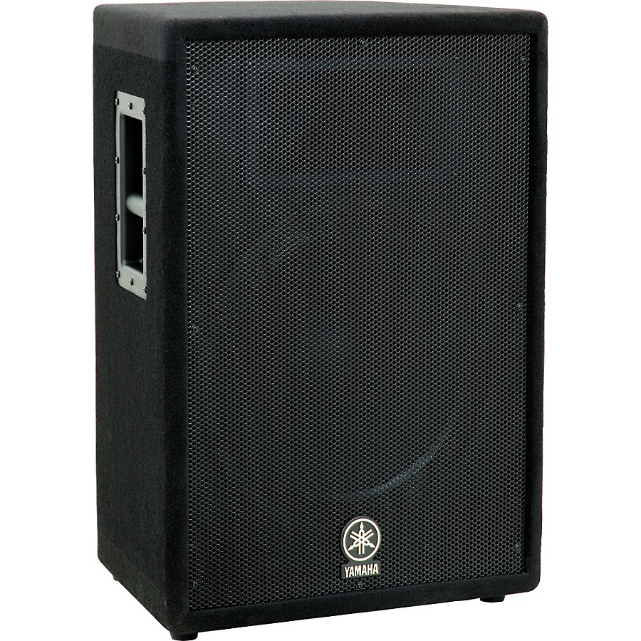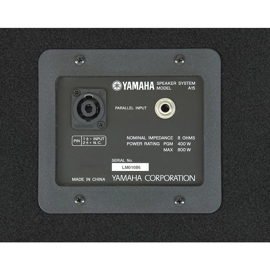 The Yamaha A15 speaker from the A Series is designed for live PA system use. It is a 2-way speaker featuring bass reflex, trapezoidal cab design, heavy grille, recessed side handles, and black carpet covering.