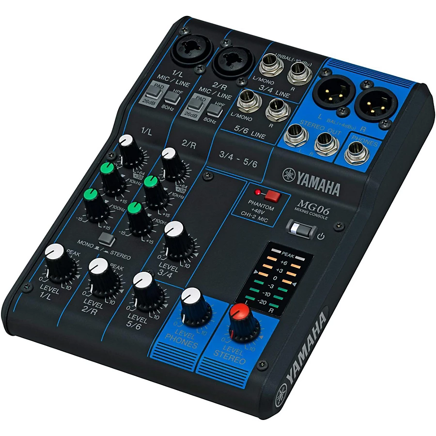 Now in its third incarnation, the MG Series embodies the pursuit of design excellence, and incorporates some of the same technologies developed for use in high-end professional consoles, including studio-quality preamps, powerful digital processing, and a rugged, reliable construction. The Yamaha MG06 is a six channel mixing console with two mic (XLR hybrid) and six Line Inputs (2 mono + 2 stereo), one Stereo Bus, and one AUX send.