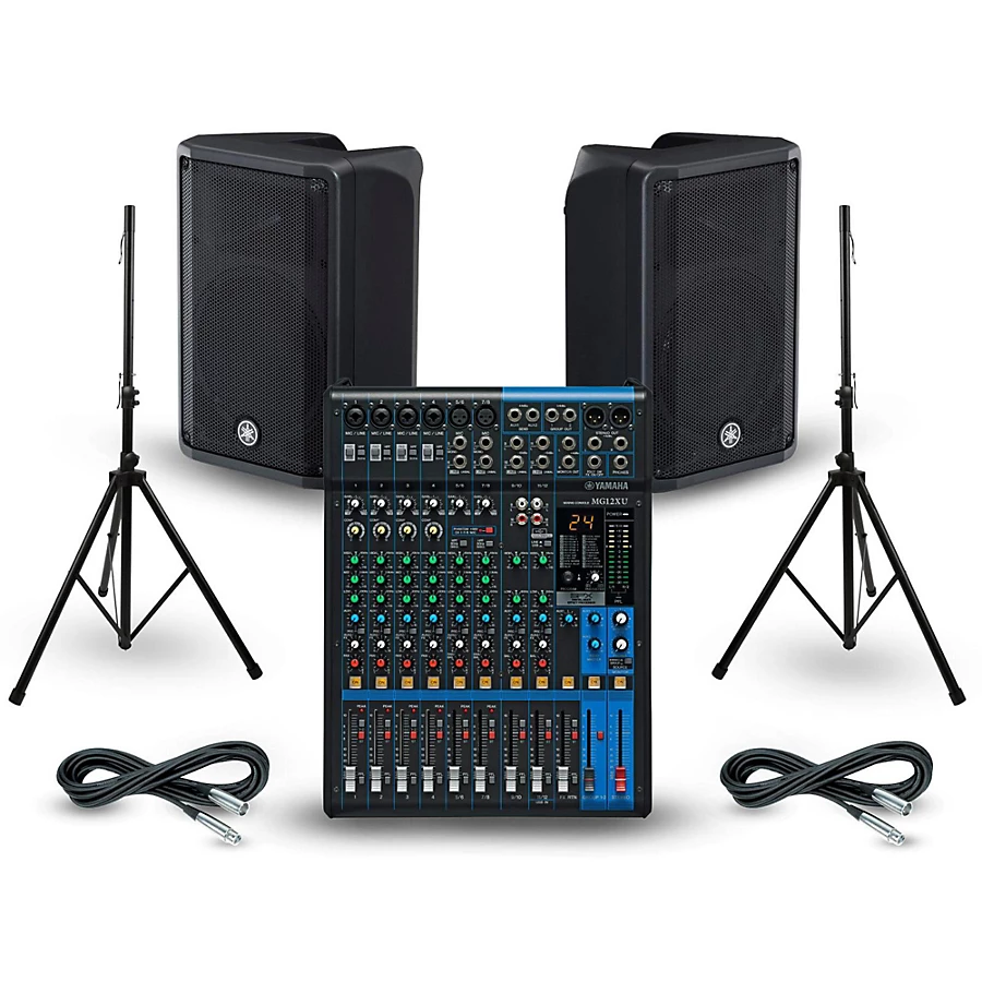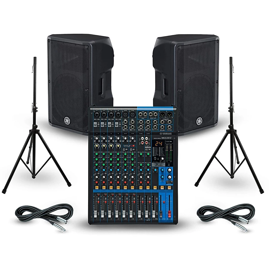 This complete PA package is available in three configurations. Each centers around the Yamaha MG12XU mixing console and is equipped with a pair of Yamaha DBR powered speakers, a pair of tripod speaker stands and a pair of XLR cables for connecting your MG12XU to your DBR Series powered speakers. The three available package configurations feature either the DBR10s, DBR12s or the DBR15s, depending on how much low end dispersion you require. This one features the DBR10s with 10" woofer.