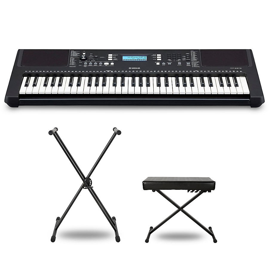Touch Tutor lesson mode tracks the velocity or strength the keys are played at in order to teach dynamics. Smart Chord lets you play great-sounding chords from simple Pop triads to complex jazz 7th chords with just a few fingers. Lite voices can be controlled with the "Art" button to intuitively reproduce the natural expressive nuances of non-keyboard instruments, allowing keyboard players to achieve realistic expression. Duo mode splits the keyboard into two halves, each with their own "middle C" for practicing with a partner. Yamaha Education Suite allows you to practice using the preset songs (or MIDI files on compatible instruments) at your own pace, one hand at a time or both together. Registration memories allow you to save and recall panel settings like voice, song, pattern and/or style to quickly access your favorite configurations. USB to HOST connectivity with MIDI and audio transfer means you only need one cable to connect to your music-making software. Also included are a stand, bench and power adapter.