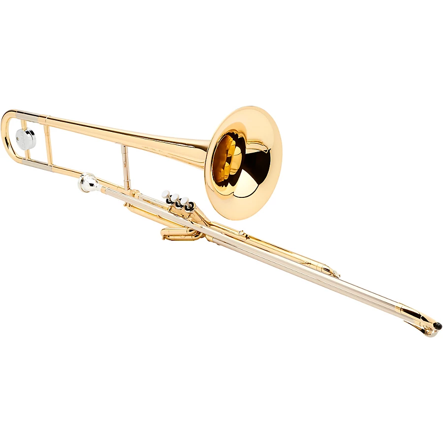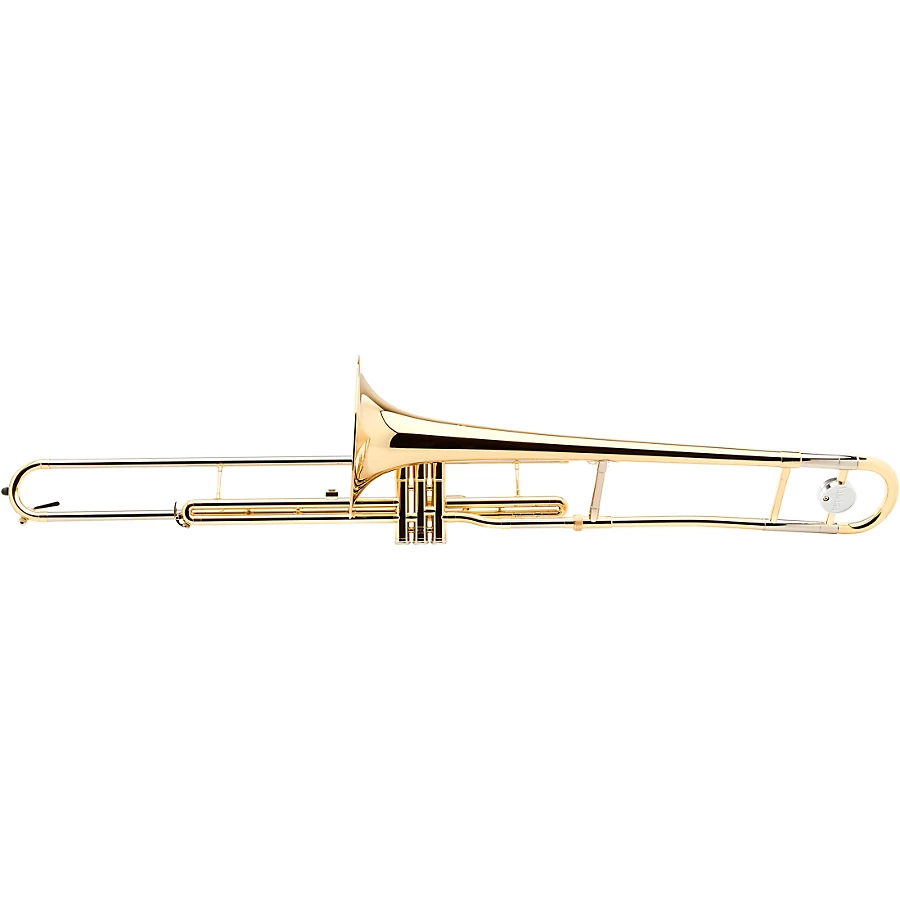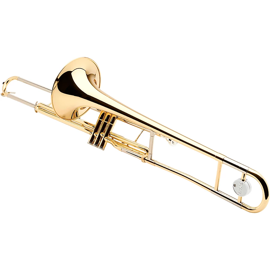 Key of Bb. .500" bore, 8" bell, gold brass mouthpipe, yellow brass outer slide, nickel plated pistons, detachable balance weight, lacquer finish. Includes case, mouthpiece, and valve oil.